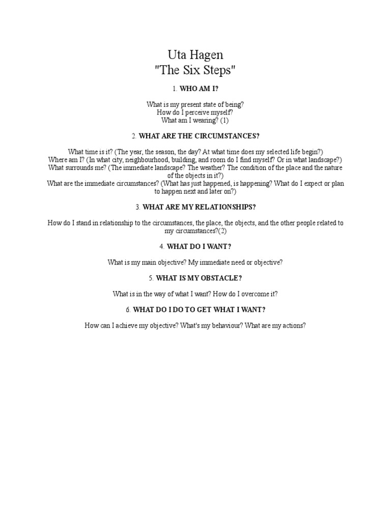 Uta Hagen 6 Steps / Uta Hagen / These are conveniently categorized as her 6 steps, and i've listed them below.